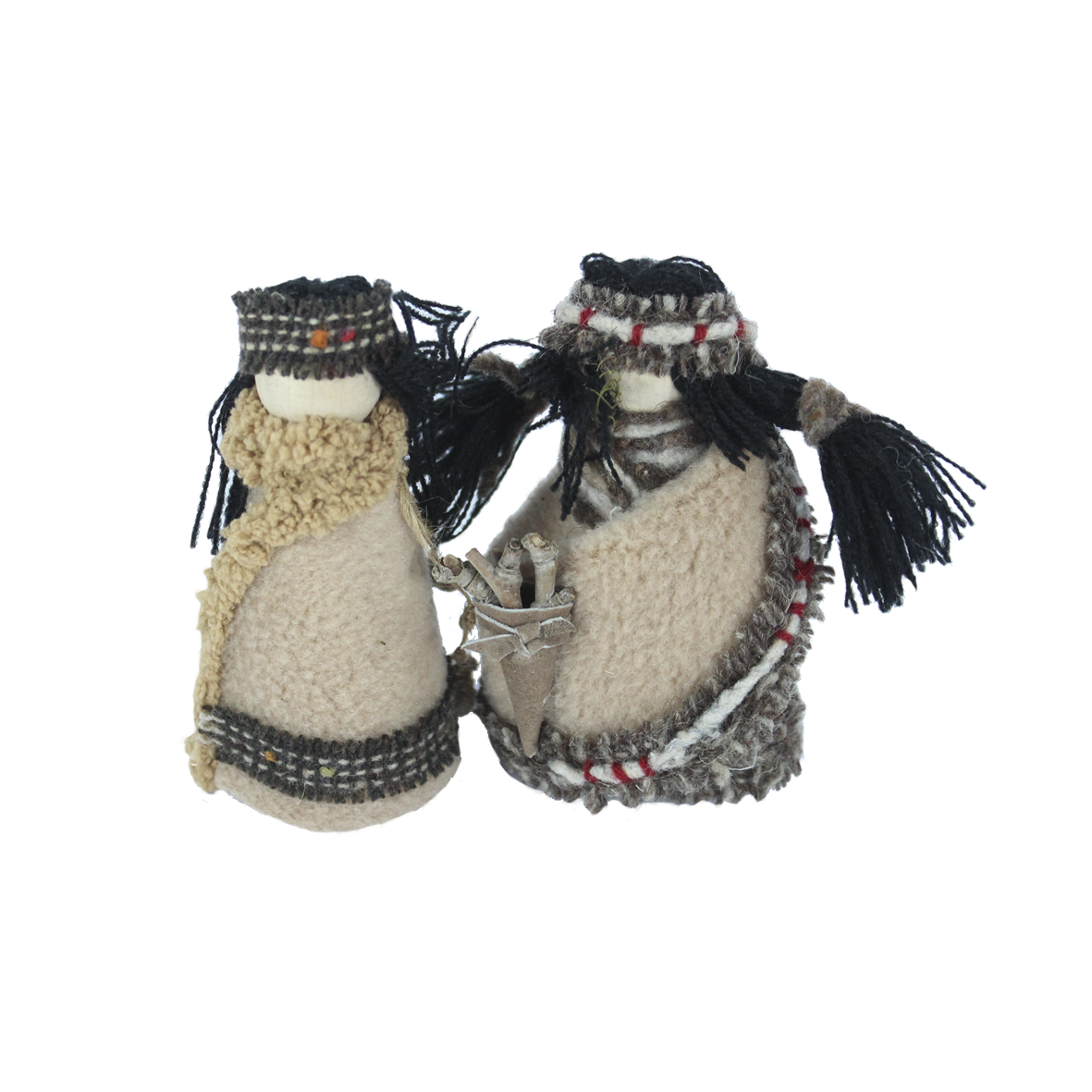 Pareja de Tehuelches fabricados a mano, con materiales en su mayoría reutilizados, con retazos de telas y otros productos, resaltando sus principales rasgos y características, como también su inconfundible vestimenta.
