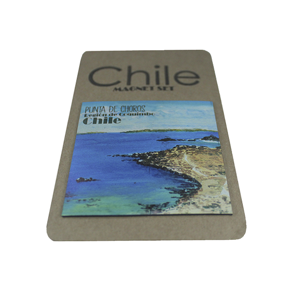 Imán individual punta Choros, impreso a full color, en base a ilustraciones exclusivas de Chile-souvenir pintadas en acuarelas y acrílicos, con un grosor de 0,75 mm, con una terminación mate que resalta sus colores y mantiene el estilo artístico del ilustrador, todos presentados en cartón craft eco-amigable de alto gramaje.